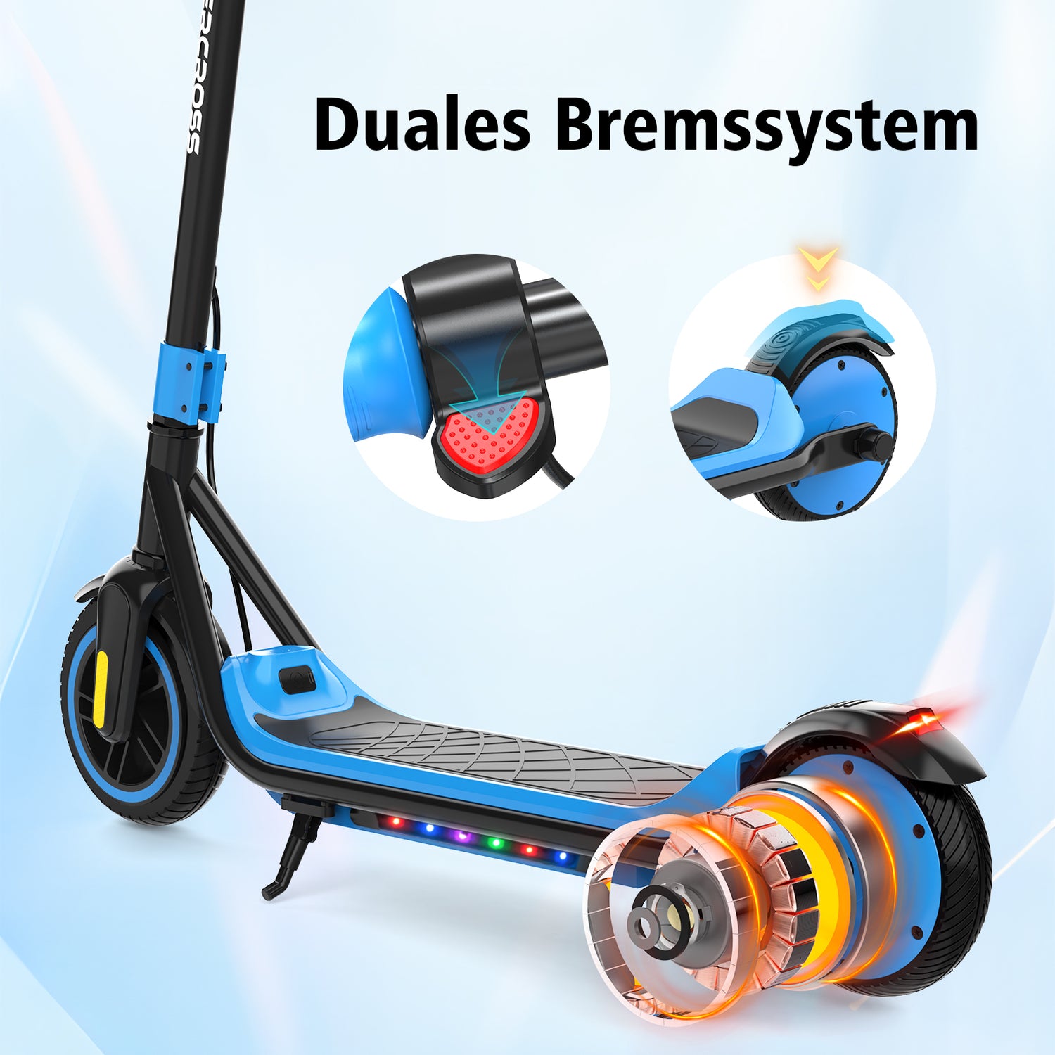 The EVERCROSS E6 children's electric scooter is equipped with a safe NON-ZERO START. Children must start as with a conventional scooter and reach a speed of at least 5 KMH to activate the motor.