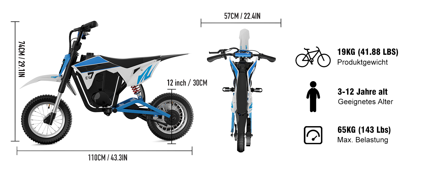 With Double front wheel suspension, seat damping and reliable braking system The motorcycle offers a safe riding experience for children from 3–12 years until 65 kg