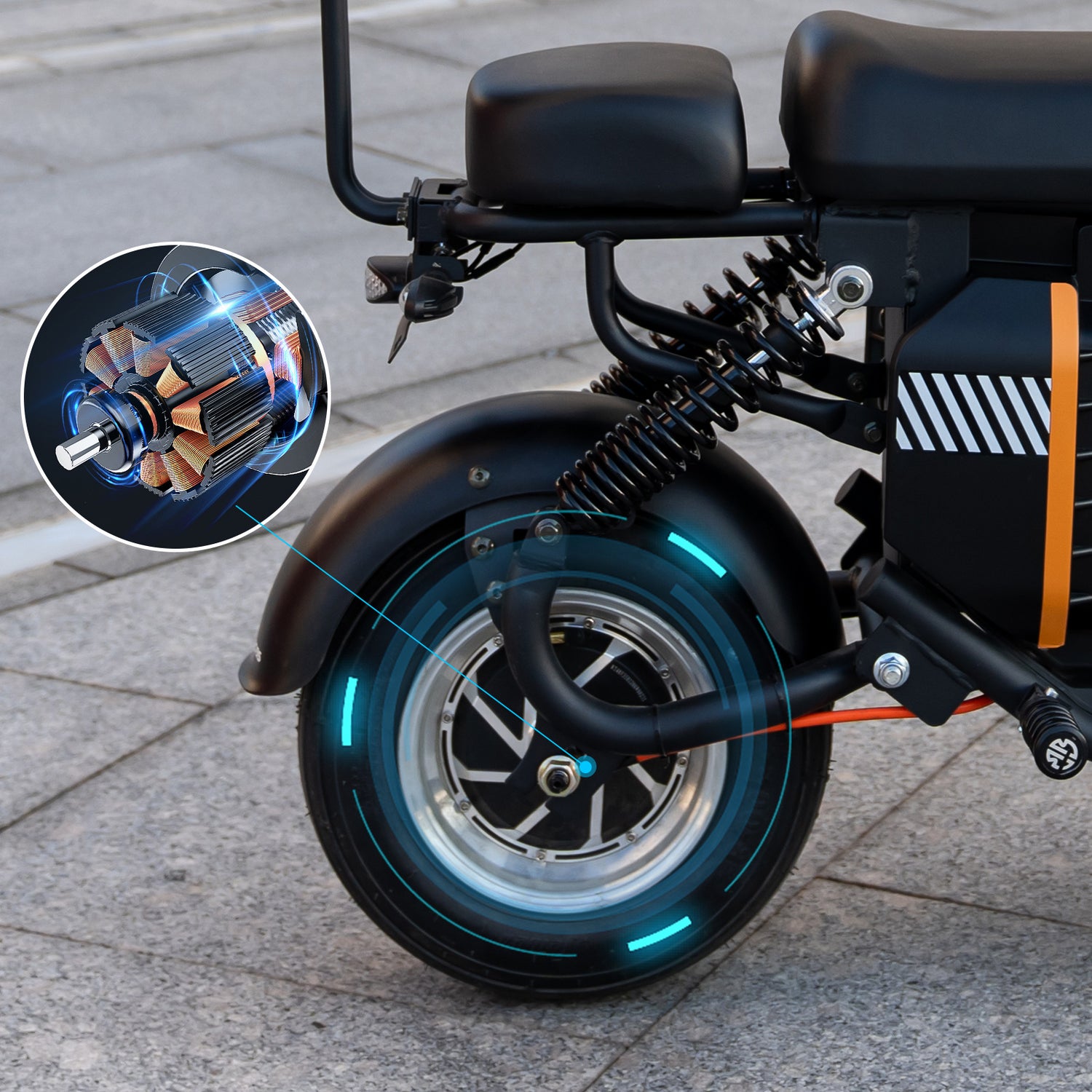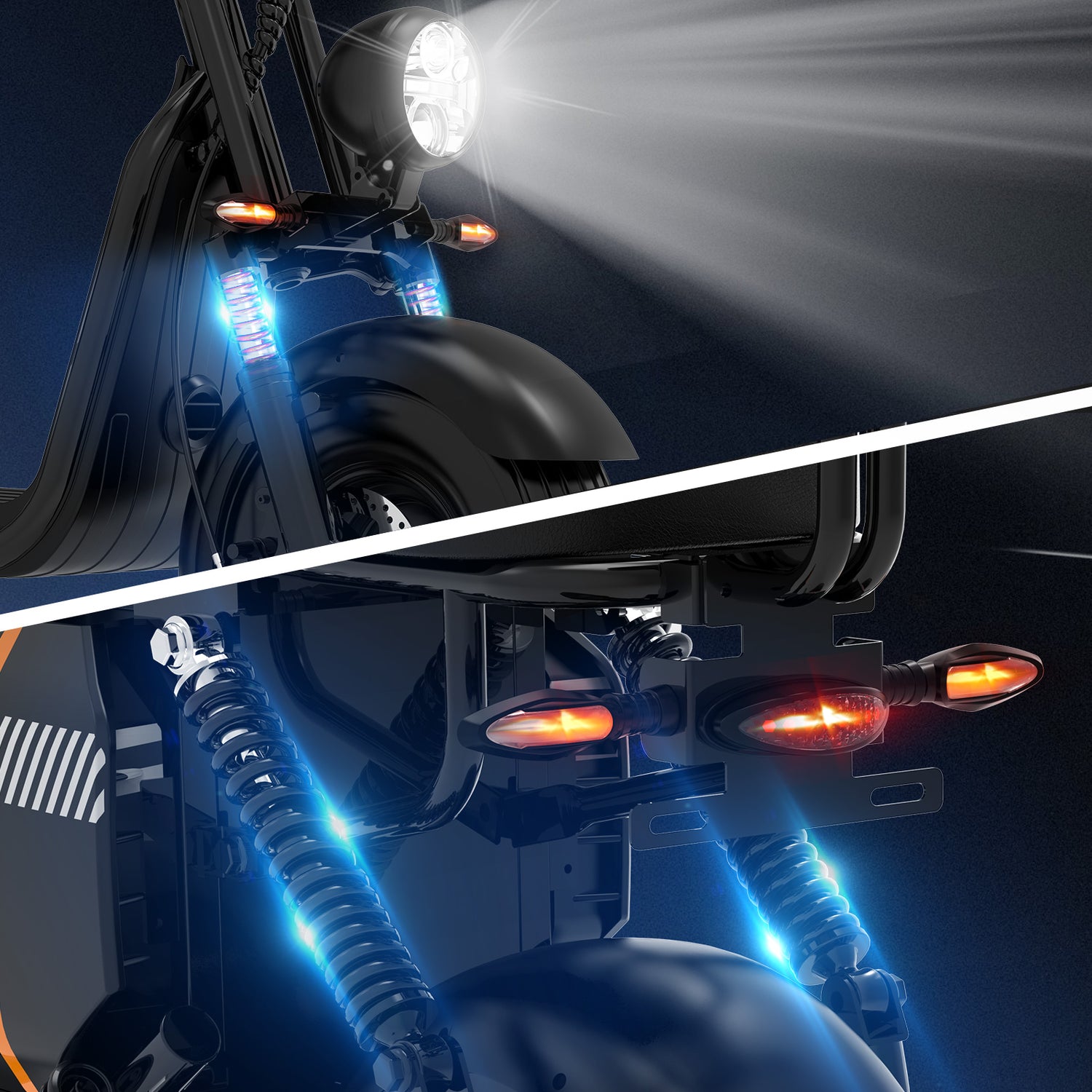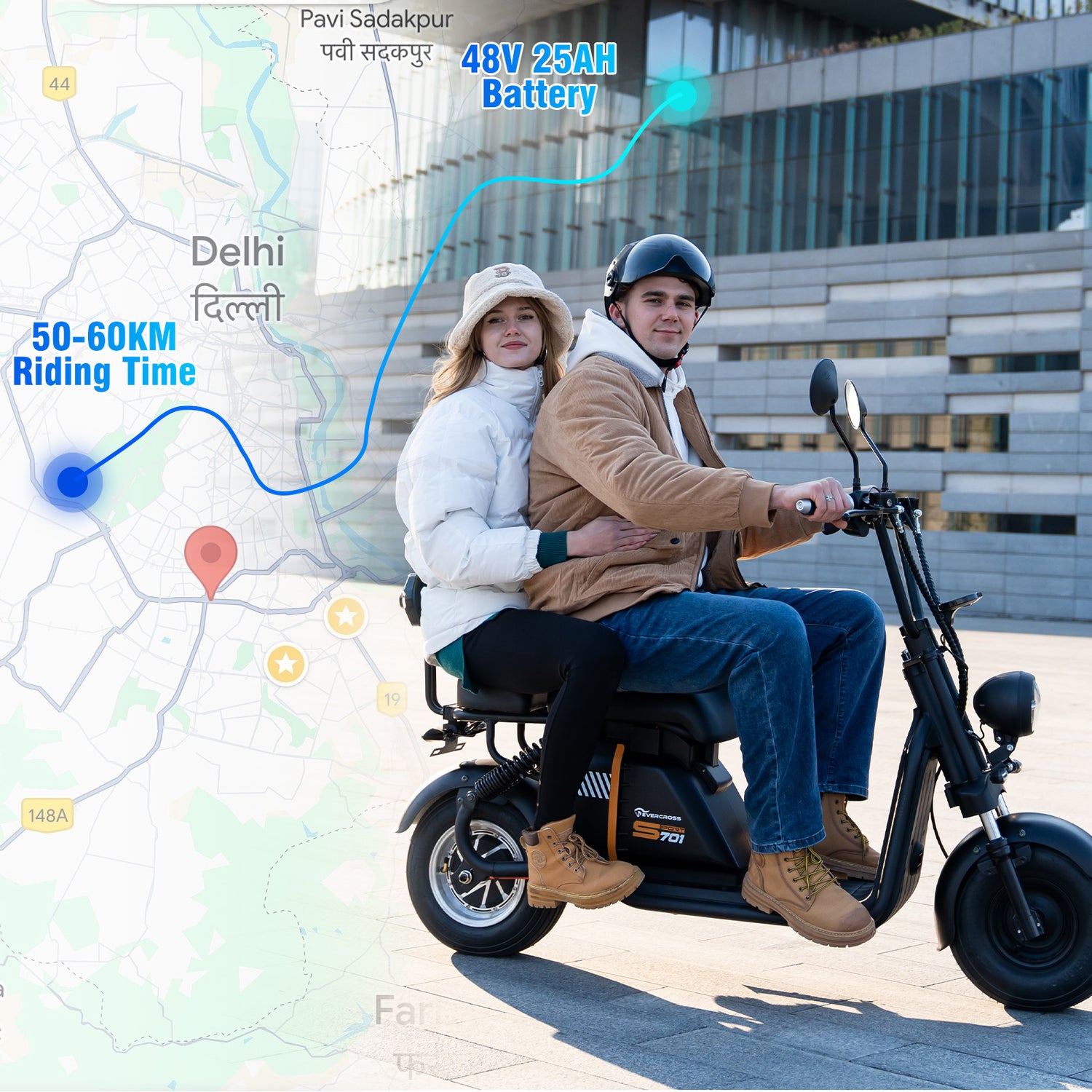 Mit einer Reichweite von bis zu 50–60 km pro Ladung eignet sich das Elektromotorrad perfekt für längere Fahrten. Die herausnehmbare 48 V / 25 Ah Lithium-Batterie ist tragbar und kann bequem zu Hause oder im Büro geladen werden – für maximale Flexibilität im Alltag.