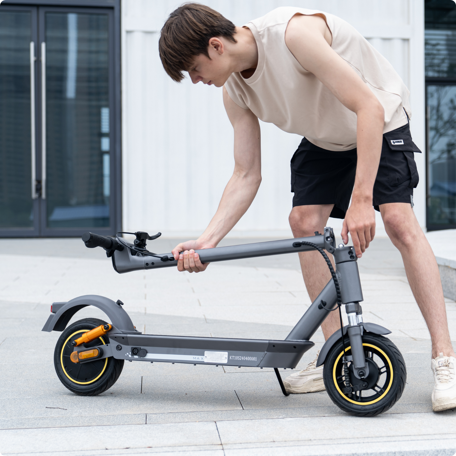 Das 3-Schritt-Faltsystem ermöglicht schnelles Zusammenklappen und einfachen Transport. Mit nur 23 kg Gewicht und einer Tragkraft von bis zu 150 kg ist der Roller robust, stabil und ideal für den täglichen Einsatz.